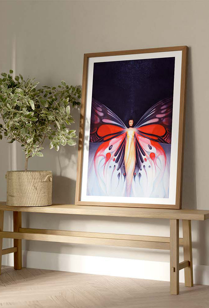 This piece is part of The Butterfly Collection, a series of monoprints created by Alexandra Cabri using a traditional hand-operated printing press. Each original was made from a single etched plate—depicting the face and body of the Butterfly Woman—using a technique called multi-drop monoprinting, where layers of ink are applied in successive passes.
