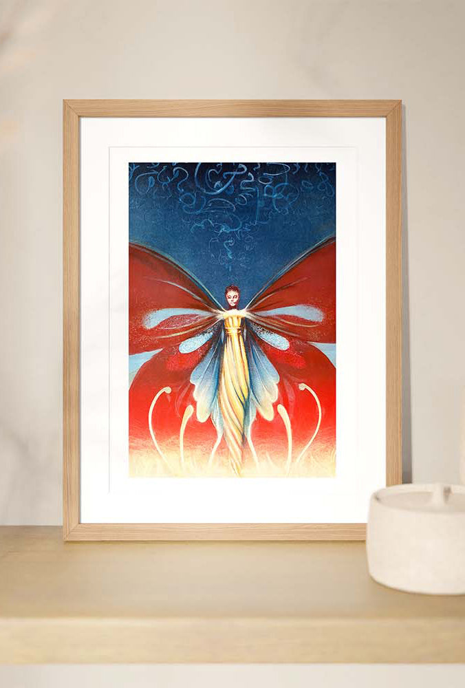 This piece is part of The Butterfly Collection, a series of monoprints created by Alexandra Cabri using a traditional hand-operated printing press. Each original was made from a single etched plate—depicting the face and body of the Butterfly Woman—using a technique called multi-drop monoprinting, where layers of ink are applied in successive passes.