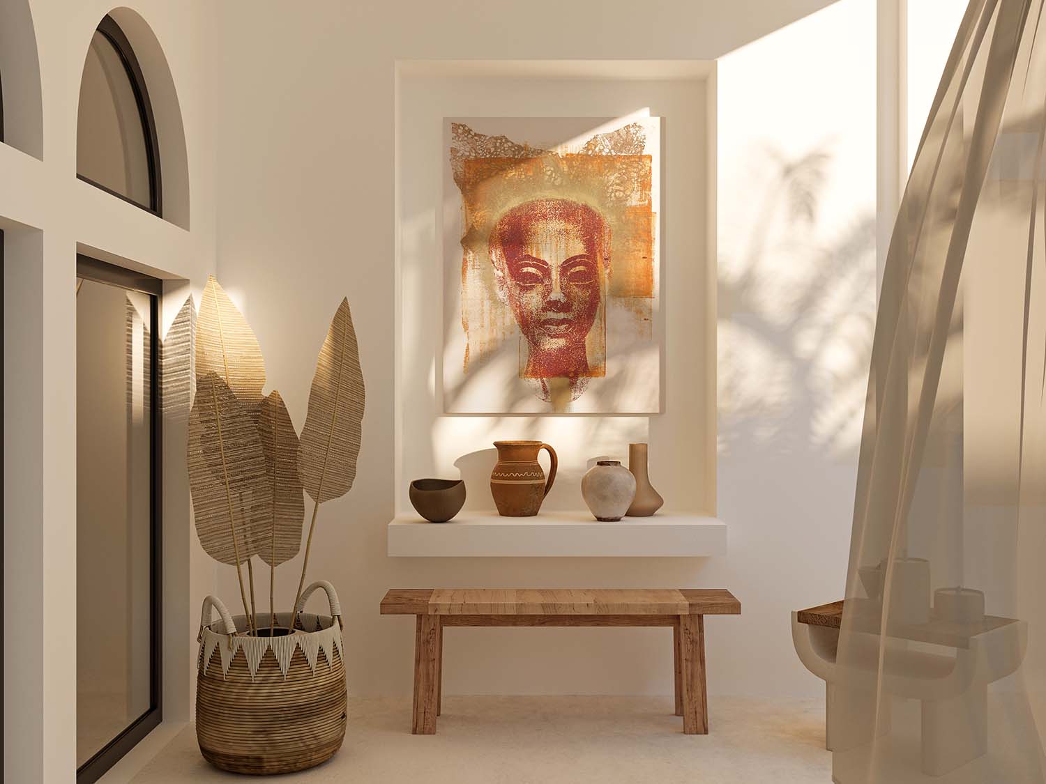 Unearthed presents a reimagined portrait of Nefertiti, inspired by one of the few surviving sculptural depictions of the queen. Rendered as a monoprint, the image carries the quiet weight of discovery—fragile yet undeniable, like a relic emerging from centuries underground.