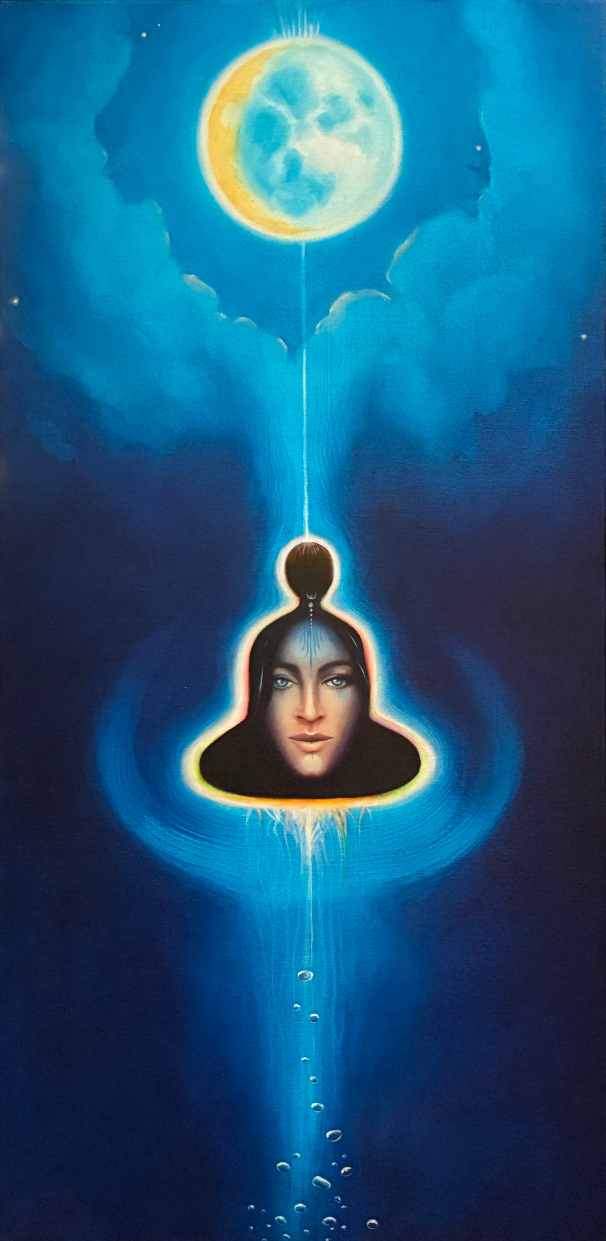 Water unfolds in a field of deep blue that is at once the infinite sky and the unfathomable abyss. At the crown, the moon radiates its quiet power, while below, the element of water reveals itself through air shaping bubbles—moments of breath rising within the depths. It invites you to dare to dive within.